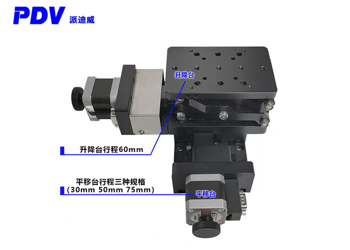 電動(dòng)平移臺(tái)行程可選30mm/50mm/70mm,電動(dòng)升降臺(tái)行程60mm。